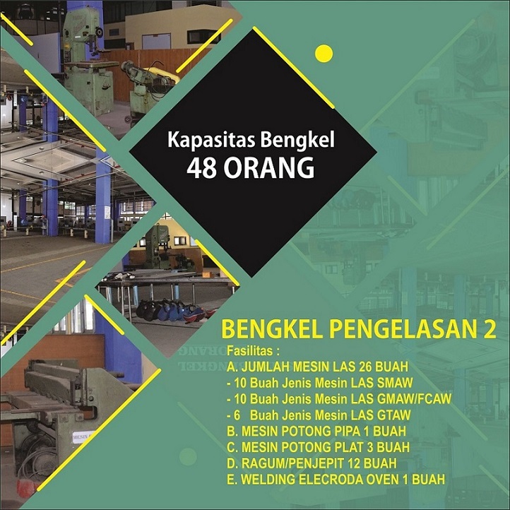 | 14. | Bengkel Las 2 | 10 buah mesin las SMAW,10 buah mesin las GMAW/FCAW,6 buah mesin las GTAW, Mesin Potong Pipa 1 Buah, Mesin Potong pipa 3 buah, Penjepit/Ragum 12 buah, Welding Elektroda Oven 1 buah | 48 | Detail |
